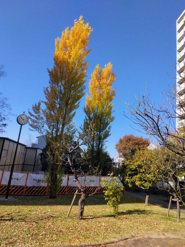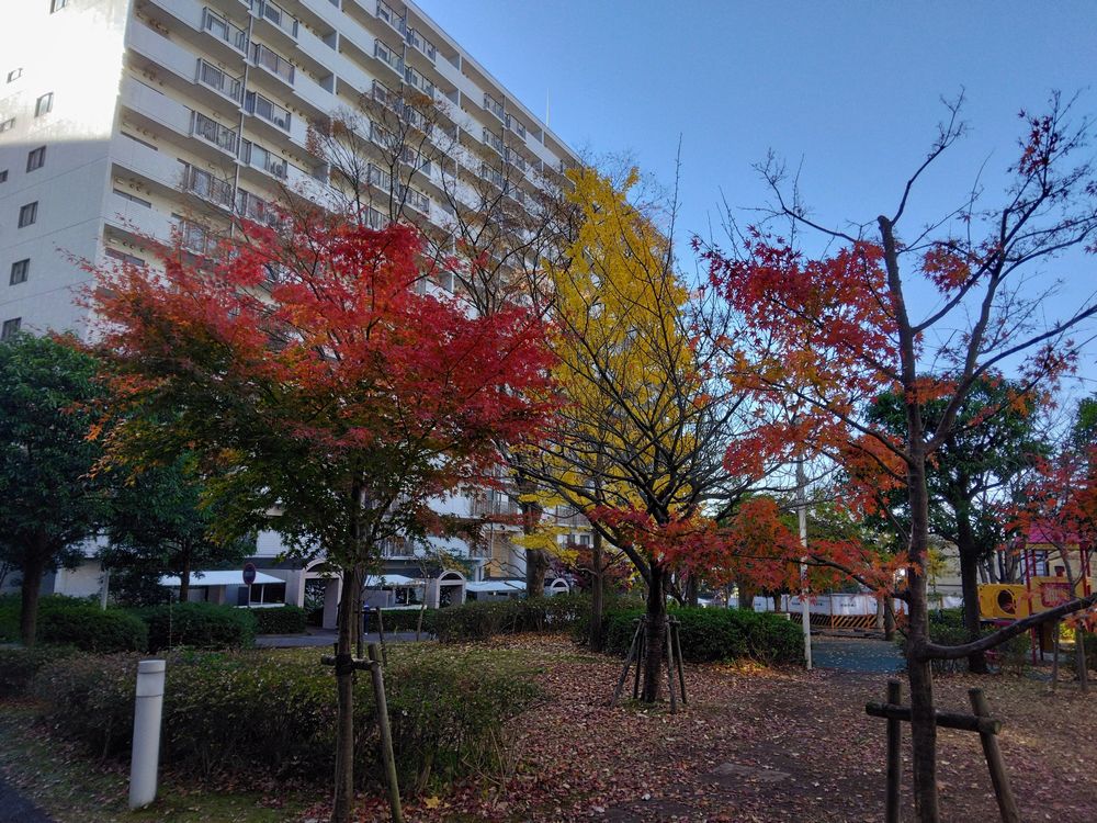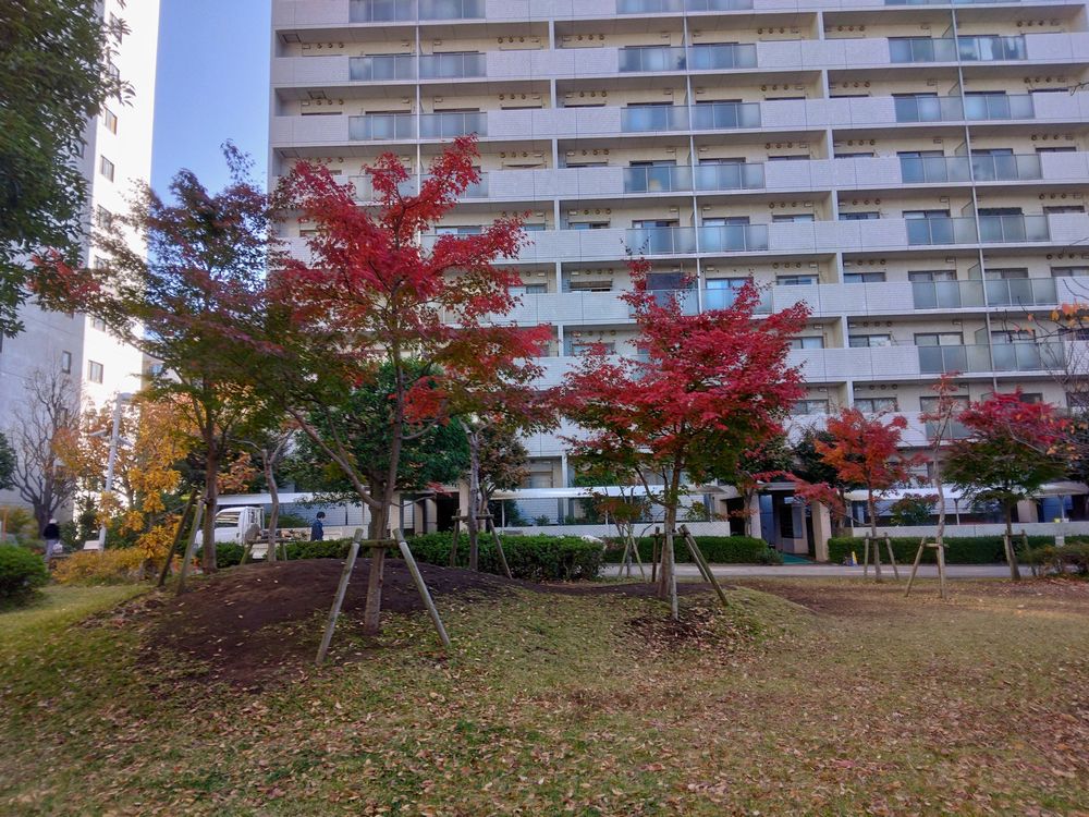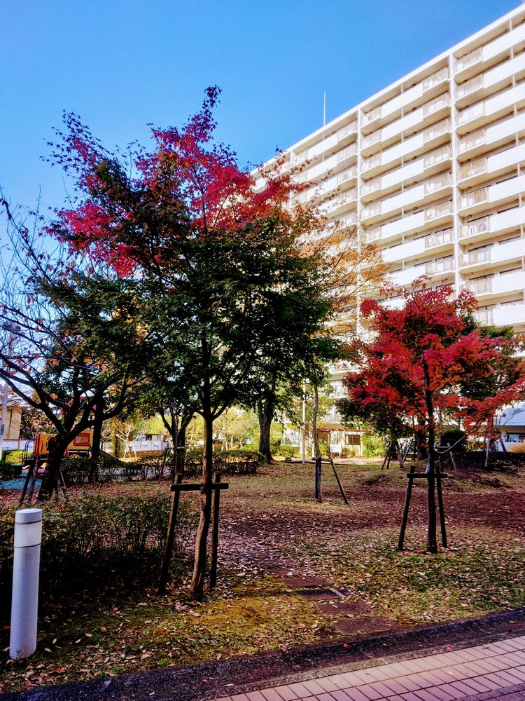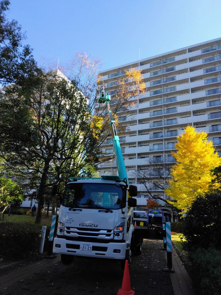 今年のパークヒルズの紅葉は色とりどりで大変きれいです。写真1:M棟側から撮った写真です。写真2:円形広場側から撮った小築山のモミジです。写真3:N棟のイチョウです。写真4:M棟側からJ棟の方向に撮ったモミジの写真です。写真5:円形広場とJ棟の間に植えられたポプラです。写真6:植栽業者グラン植栽業者グランスケープ(有)が無償で植えてくれた(A棟、C棟、E棟)西洋ニンジンボクという低木です。来年春に薄紫色の花が咲きます。写真7:K棟前の大木ケヤキの縮小剪定を行っている写真です。