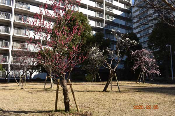 | 管理センタ裏庭から昨年円形広場に移植した、オカメ桜です。奥に見えるのは梅です。 | J棟I棟間のパ”クヒルズ梅園”です。 |